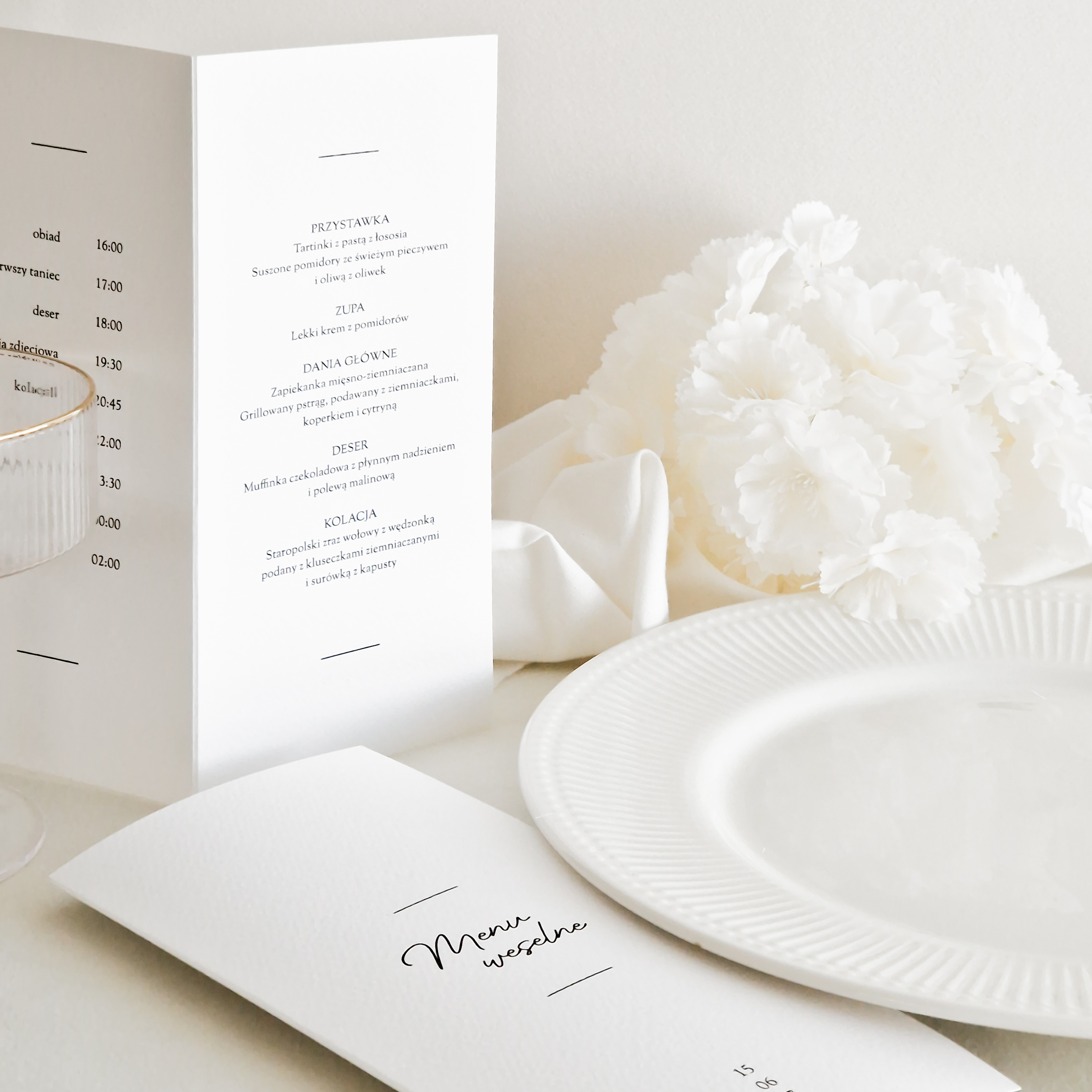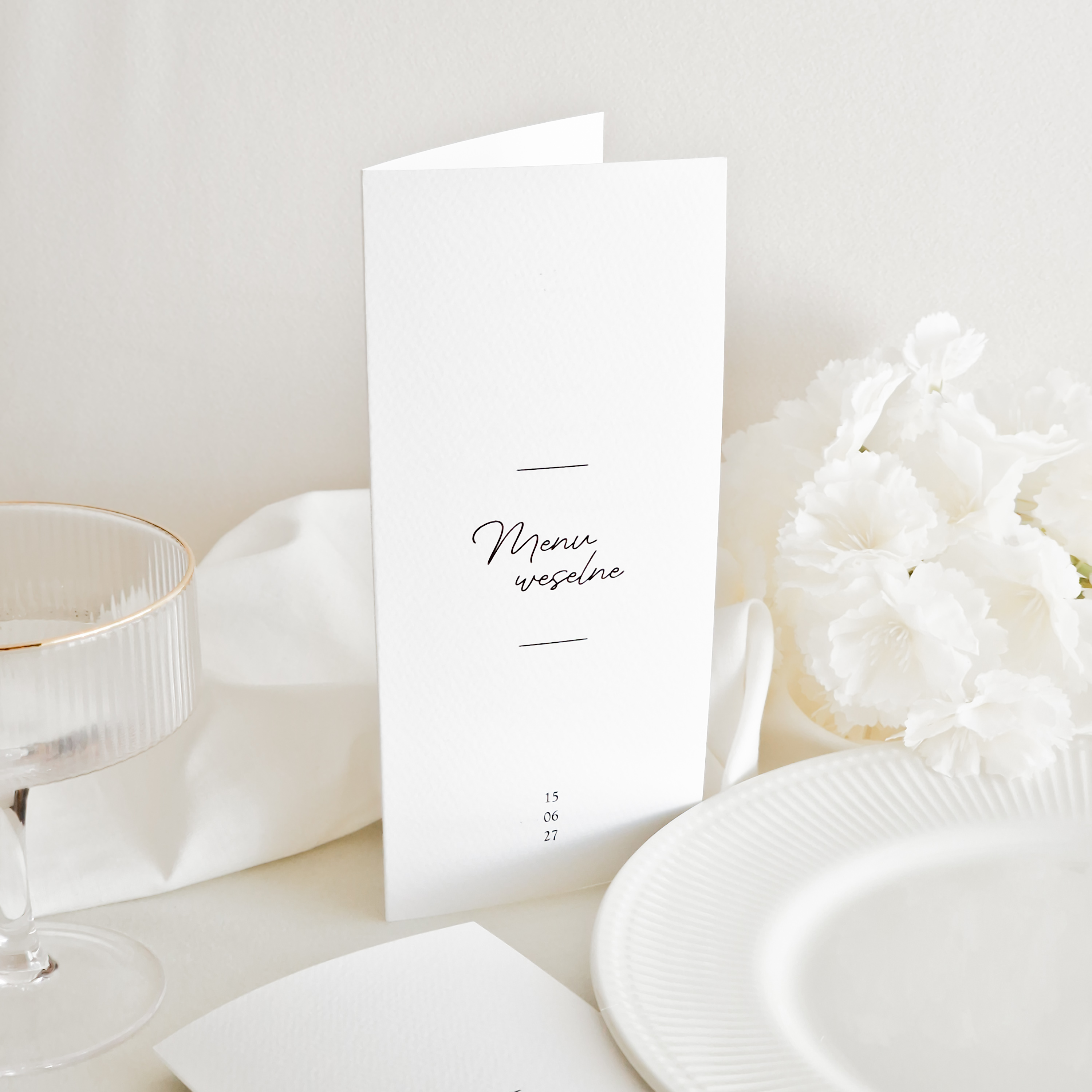 Składane menu weselne lub plan wesela  to subtelny, spójny detal, który łączy elegancję z funkcjonalnością, tworząc harmonijną dekorację stołu.