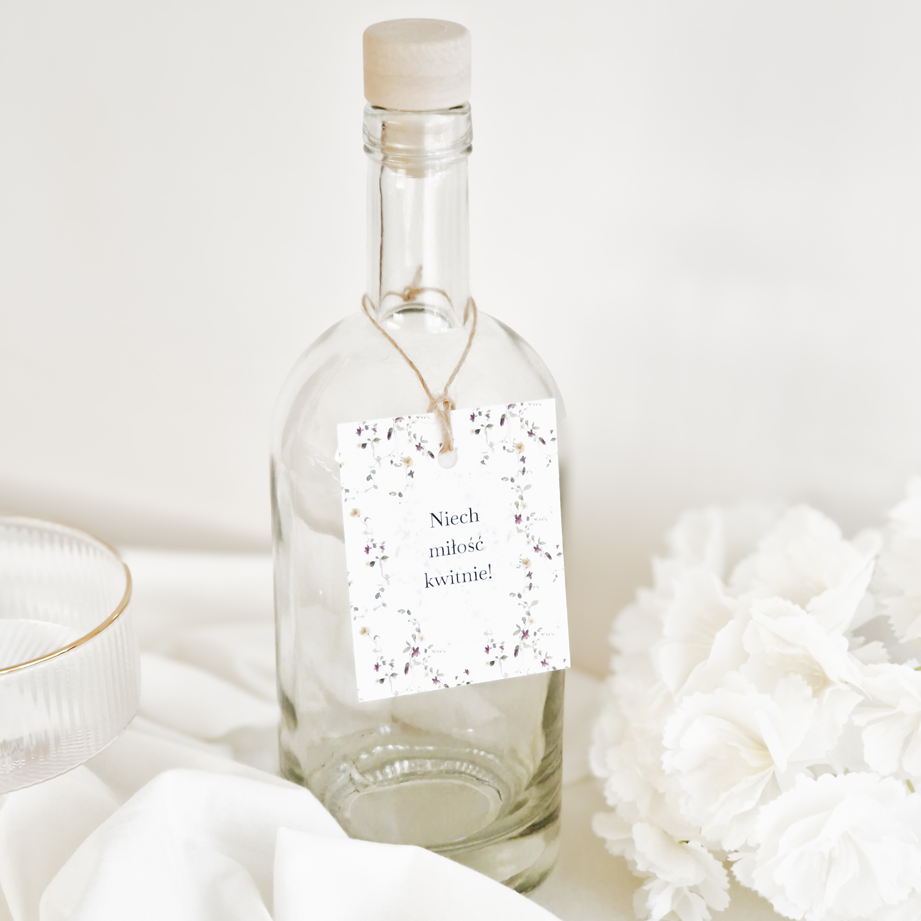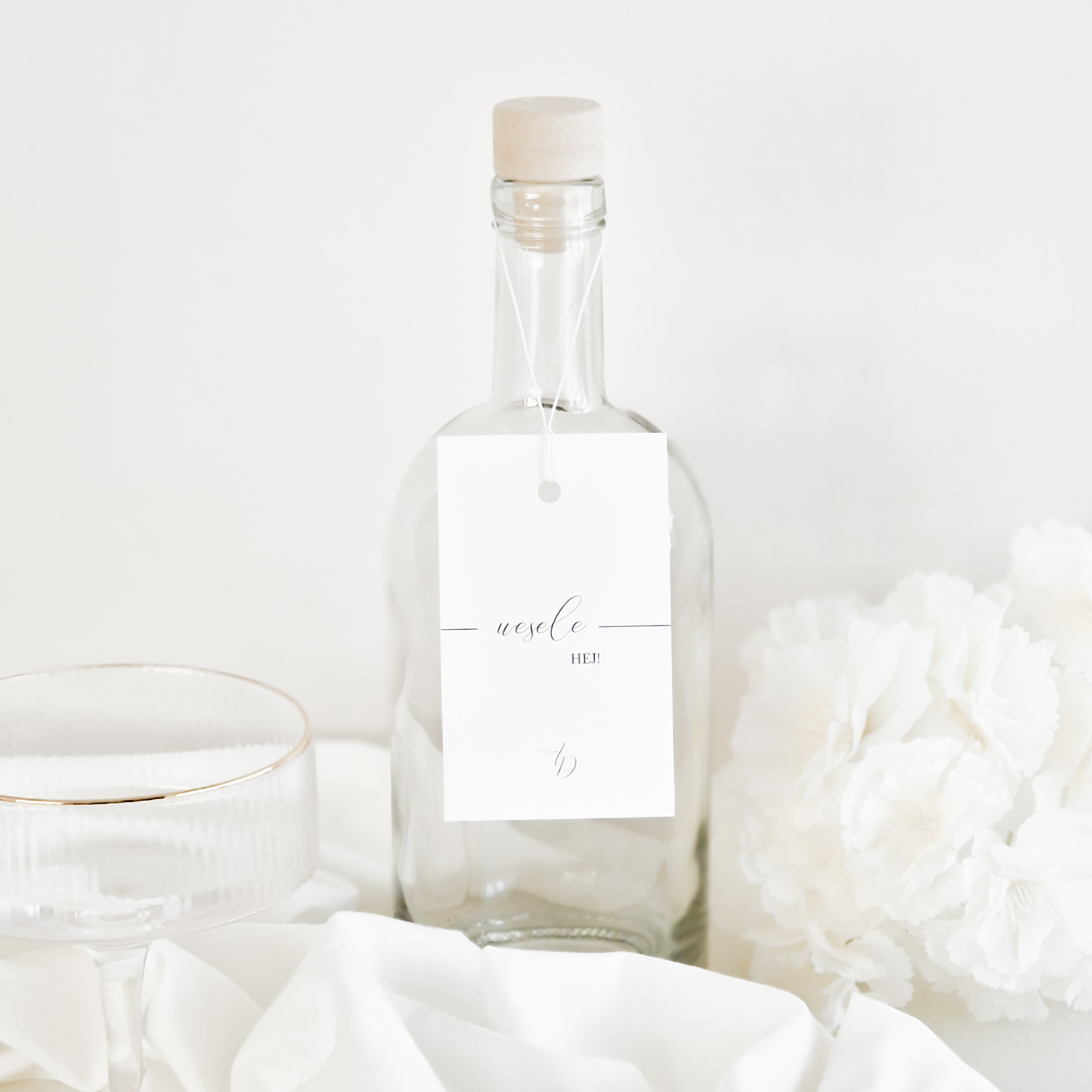 Klasyczna zawieszka na alkohol to subtelny, a jednocześnie efektowny detal, który pięknie uzupełnia dekorację stołu weselnego. Wykonana z papieru o wysokiej gramaturze i zawieszona na sznurku, sprawdzi się przy butelkach wina, wódki czy domowych nalewek.